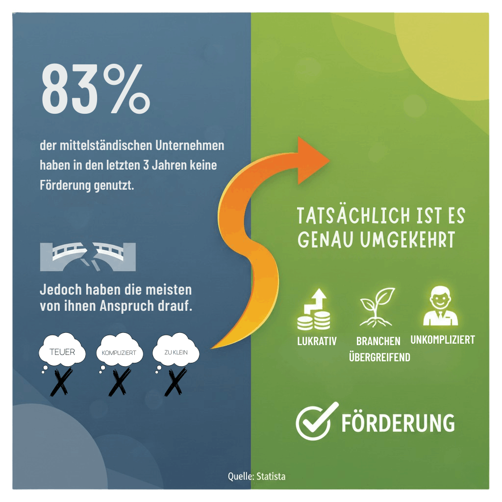 Laut Statista haben 83% der mittelständischen Unternehmen in den letzten 3 Jahren keine Förderung genutzt. Jedoch haben die meisten von ihnen Anspruch darauf.
