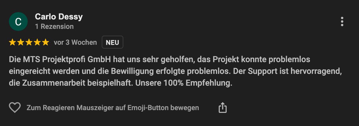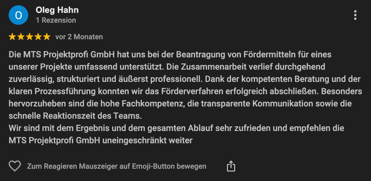 Eine Förderprüfung von Projektprofi ist nicht nur juristisch sauber, sondern auch sachlich so optimiert, dass Sie die maximale Fördersumme bekommen.