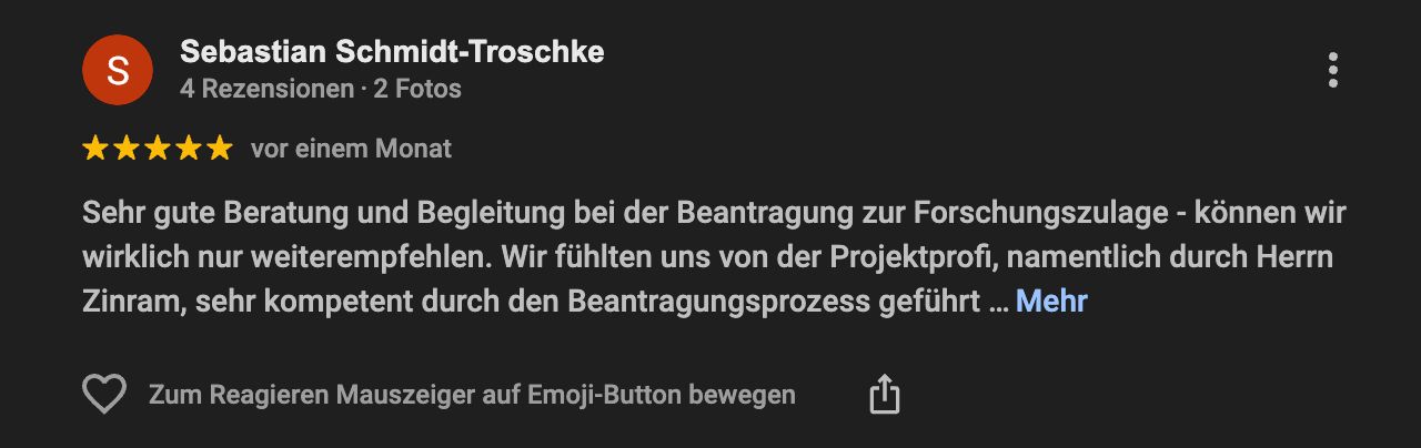Unabhängig davon gilt: Unsere Methode ist auf die Anforderungen der Forschungszulage ausgerichtet und funktioniert auch bei spezialisierten oder ungewöhnlichen Branchen.